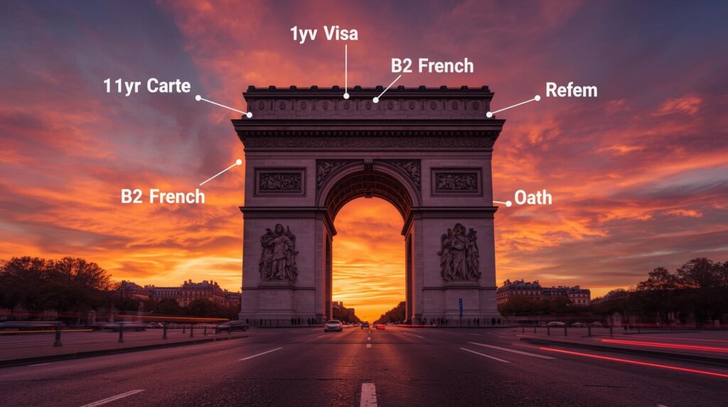 أوّلاً، إقامة قانونية 5 سنوات مستمرة (Carte de Séjour). ثانياً، امتحان B2 فرنسي (DELF/DALF) إلزامي. ثالثاً، اختبار الدمج المدني (Républican Values) من 2026.