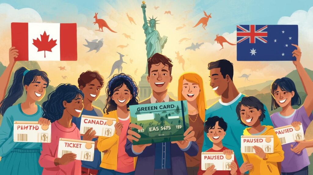 أمريكا رجعت؟ لا – DV-2027 معلّق، DV-2026 مستمر لحد سبتمبر. أفضل بديل؟ كندا 3.5% فوز. مصر مؤهلة؟ نعم كندا، أستراليا، أيرلندا، بريطانيا. التقديم مجاني؟ 100% – احذر المكاتب. العائلة تشارك؟ نعم زوج + أطفال <21. بعد الفوز كم الإقامة؟ 6-12 شهر مقابلات + فحوصات.